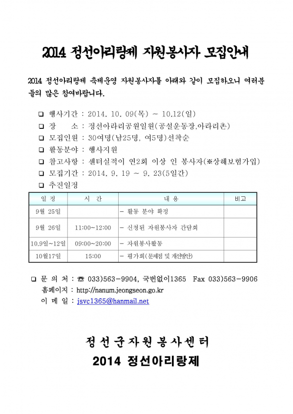 2014 정선아리랑제 자원봉사자 모집 공고 페이지 정보 작성자 관리자 작성일14-09-22 11:26 조회18,335회 관련링크 이전글 다음글 목록 본문 2014 정선아리랑제 자원봉사자 모집 이전글 다음글 목록