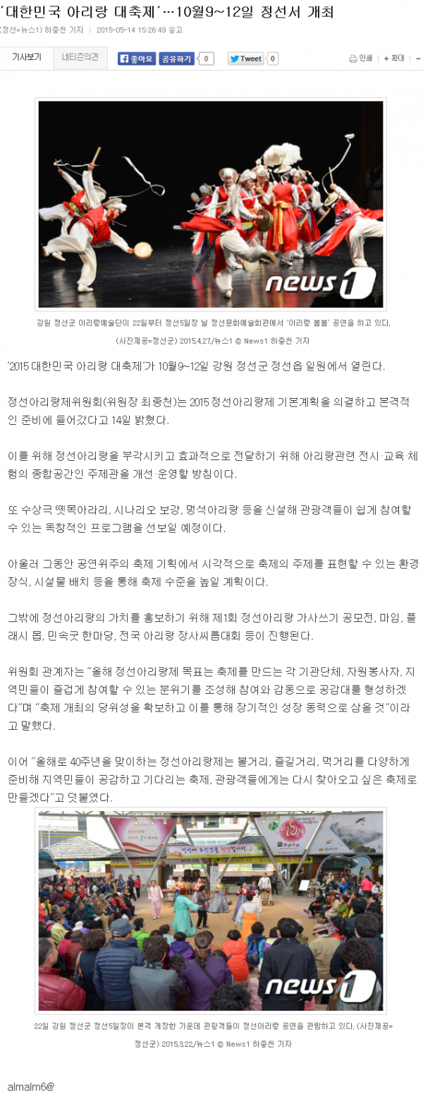 대한민국 아리랑 대축제' 10월9~12일 정선서 개최 페이지 정보 작성자 관리자 작성일19-07-17 20:35 조회18,135회 관련링크 이전글 다음글 목록 본문 2015 대한민국 아리랑 대축제’가 10월9~12일 강원 정선군 정선읍 일원에서 열린다. 이전글 다음글 목록