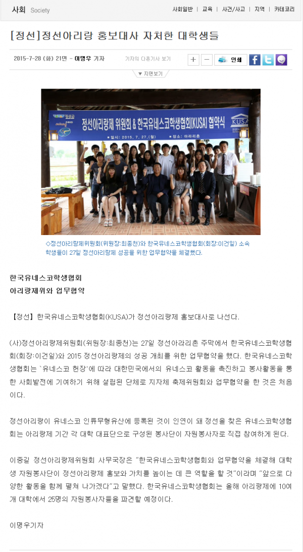 [정선]정선아리랑 홍보대사 자처한 대학생들 페이지 정보 작성자 관리자 작성일19-07-17 20:53 조회17,477회 관련링크 이전글 다음글 목록 본문 한국유네스코학생협회(KUSA)가 정선아리랑제 홍보대사로 나선다. 이전글 다음글 목록