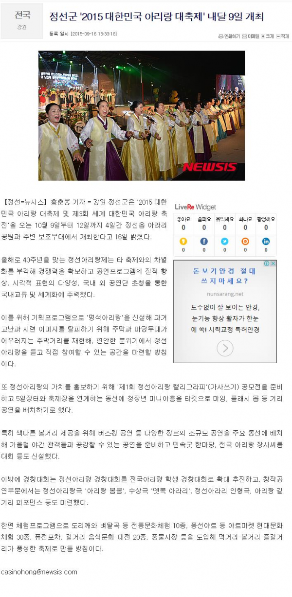 정선군 '2015 대한민국 아리랑 대축제' 내달 9일개최 페이지 정보 작성자 관리자 작성일19-07-17 20:57 조회17,885회 관련링크 이전글 다음글 목록 본문 이전글 다음글 목록