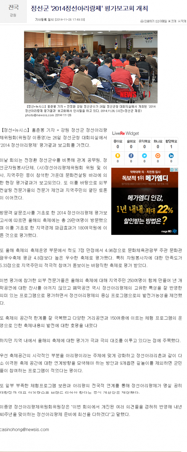 정선군 '2014정선아리랑제' 평가보고회 개최 페이지 정보 작성자 관리자 작성일19-07-17 20:29 조회17,836회 관련링크 이전글 다음글 목록 본문 정선군청 대회의실에서 '2014' 평가결과 보고회를 가졌다 이전글 다음글 목록