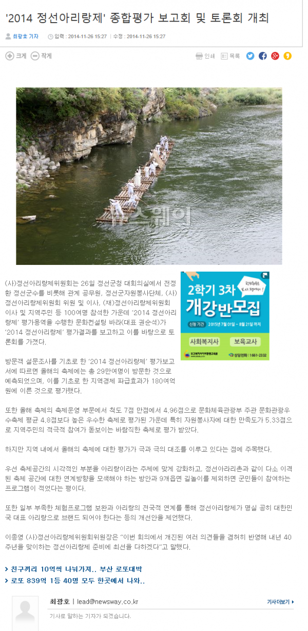 '2014 정선아리랑제' 종합평가 보고회 및 토론회 개최 페이지 정보 작성자 관리자 작성일19-07-17 20:31 조회17,967회 관련링크 이전글 다음글 목록 본문 2014 정선아리랑제’ 평가결과를 보고하고 이를 바탕으로 토론회를 가졌다. 이전글 다음글 목록