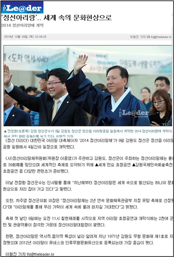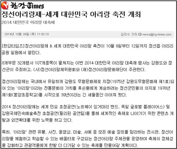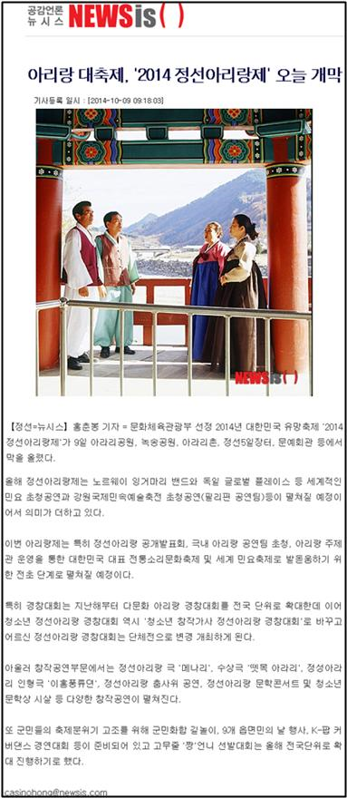 '정선아리랑' 세계 속의 문화현상으로 페이지 정보 작성자 관리자 작성일19-07-16 20:19 조회16,854회 관련링크 이전글 다음글 목록 본문 대한민국 아리랑 대축제이자 '2014 정선아리랑제'가 9일 4일간의 일정으로 개막했다 이전글 다음글 목록