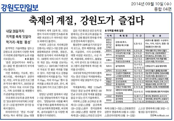축제의 계절, 강원도가 즐겁다 페이지 정보 작성자 관리자 작성일19-07-16 19:00 조회17,795회 관련링크 이전글 다음글 목록 본문 내달 26일까지 지역별 축제 잇달아 이전글 다음글 목록
