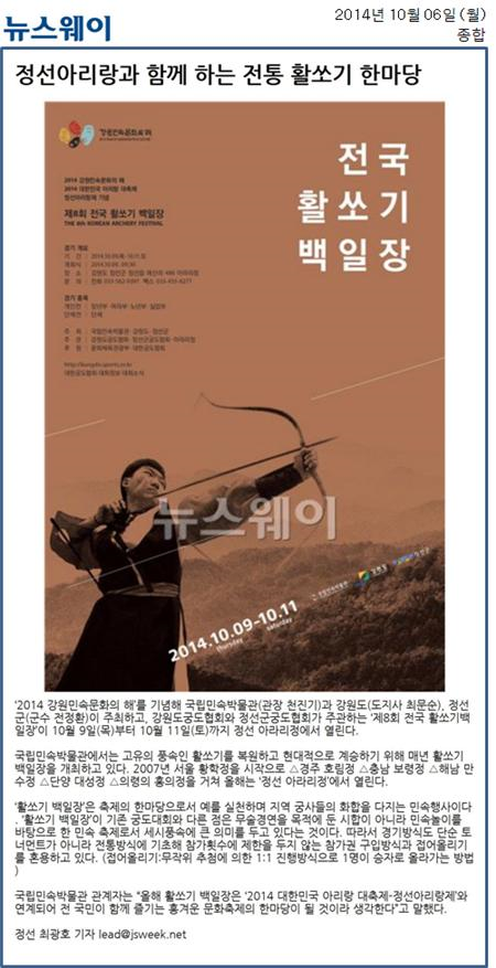 정선아리랑과 함께 하는 전통 활쏘기 한마당 페이지 정보 작성자 관리자 작성일19-07-16 19:15 조회17,481회 관련링크 이전글 다음글 목록 본문 제8회 전국 활쏘기 백일장 정선서 개최 이전글 다음글 목록