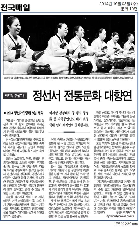 정선서 전통문화 대향연 페이지 정보 작성자 관리자 작성일19-07-16 20:06 조회17,175회 관련링크 이전글 다음글 목록 본문 아리랑 경창대회등 행사 풍성 이전글 다음글 목록
