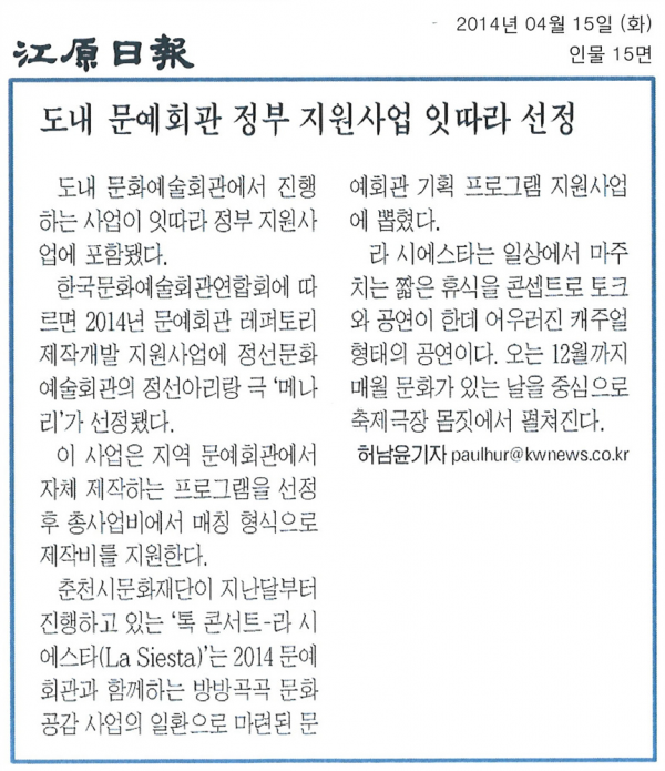 정선아리랑극 '메나리' 페이지 정보 작성자 관리자 작성일19-07-16 16:16 조회17,405회 관련링크 이전글 다음글 목록 본문 2014년 문예회관 레퍼토리 제작개발 지원사업 선정 이전글 다음글 목록