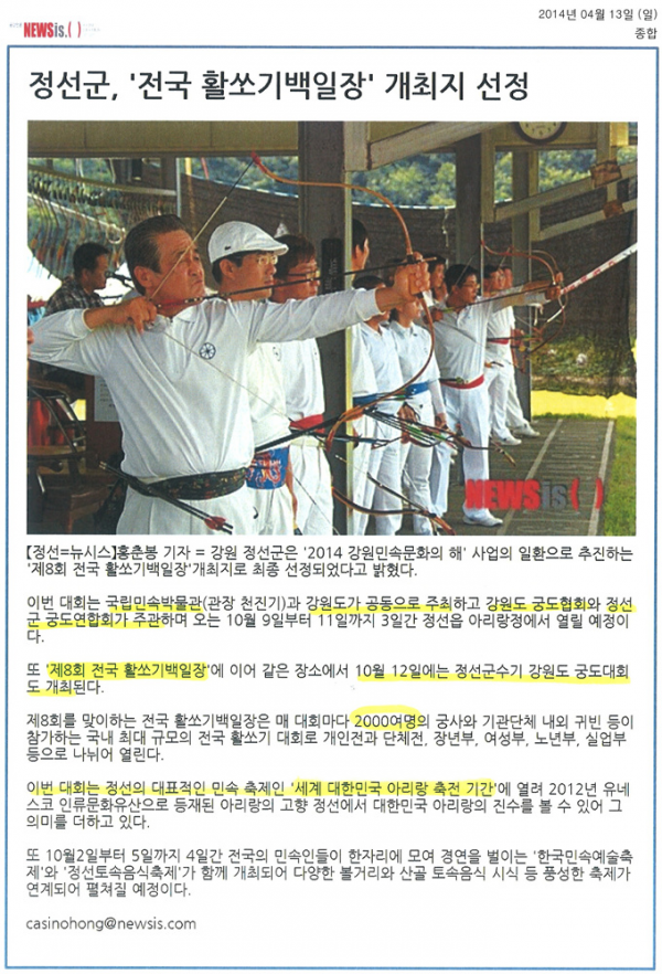 정선군 '전국 활쏘기백일장' 개최지 선정 (정선아리랑제 기간에 개최) 페이지 정보 작성자 관리자 작성일19-07-16 16:23 조회17,478회 관련링크 이전글 다음글 목록 본문 정선군 '전국 활쏘기백일장' 개최지 선정 이전글 다음글 목록