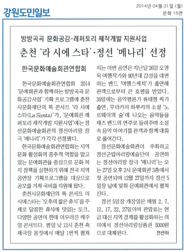 정선아리랑 창극 '메나리' 27일 오후2시 첫공연 페이지 정보 작성자 관리자 작성일19-07-16 16:35 조회17,894회 관련링크 이전글 다음글 목록 본문 정선아리랑 창극 '메나리' 27일 오후2시 첫공연 이전글 다음글 목록