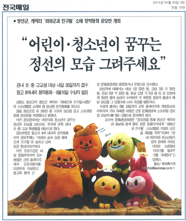 정선군 캐릭터 '와와군과 친구들' 창작동화 공모전 페이지 정보 작성자 관리자 작성일19-07-16 16:35 조회17,941회 관련링크 이전글 다음글 목록 본문 정선군 캐릭터 '와와군과 친구들' 창작동화 공모전 이전글 다음글 목록