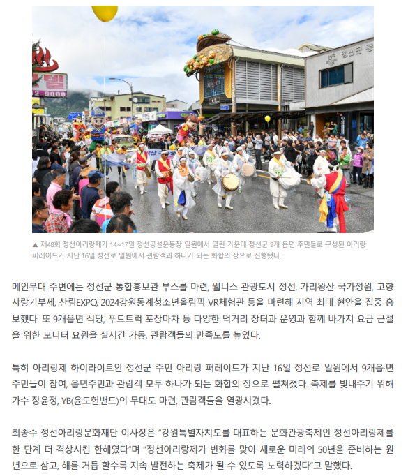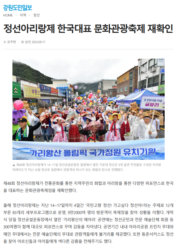 정선아리랑제 한국대표 문화관광축제 재확인 페이지 정보 작성자 관리자 작성일23-09-19 10:09 조회6,185회 관련링크 이전글 다음글 목록 본문 정선아리랑제 한국대표 문화관광축제 재확인 / 강원도민일보, 유주현 기자 이전글 다음글 목록