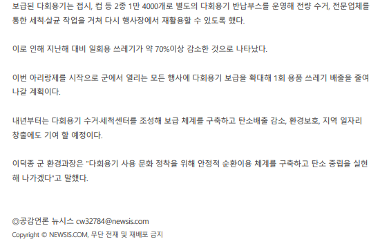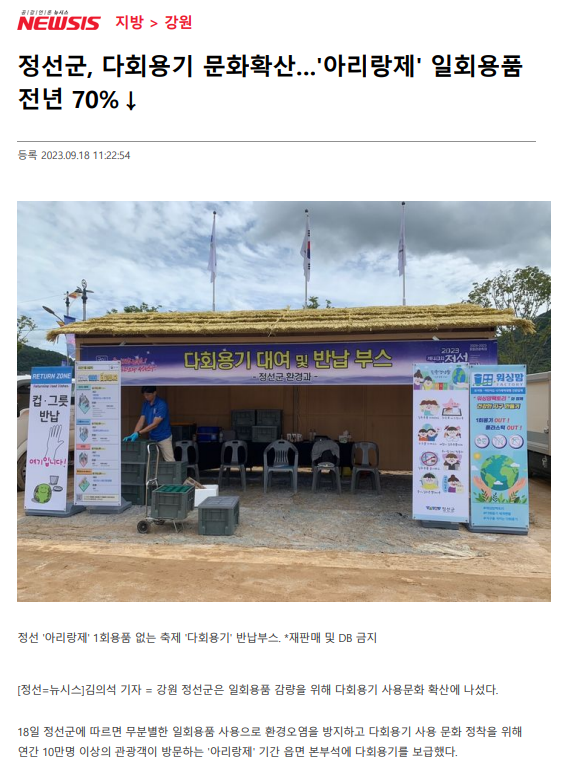 정선군, 다회용기 문화확산…'아리랑제' 일회용품 전년 70%↓ 페이지 정보 작성자 관리자 작성일23-09-19 11:08 조회6,268회 관련링크 이전글 다음글 목록 본문 정선군, 다회용기 문화확산…'아리랑제' 일회용품 전년 70%↓ / 뉴시스, 김의석 기자 이전글 다음글 목록