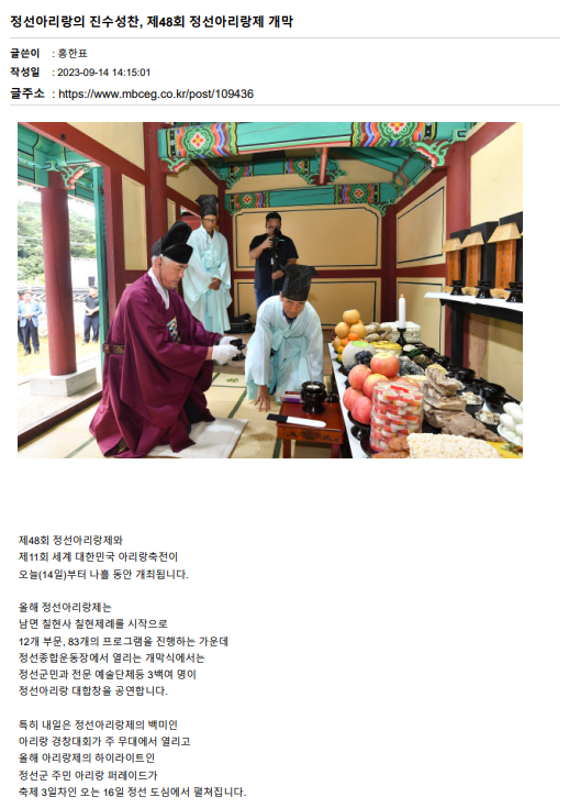 정선아리랑의 진수성찬, 제48회 정선아리랑제 개막 페이지 정보 작성자 관리자 작성일23-09-18 16:08 조회6,562회 관련링크 이전글 다음글 목록 본문 정선아리랑의 진수성찬, 제48회 정선아리랑제 개막 / mbc강원영동, 홍한표 기자 이전글 다음글 목록