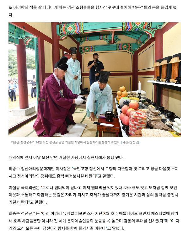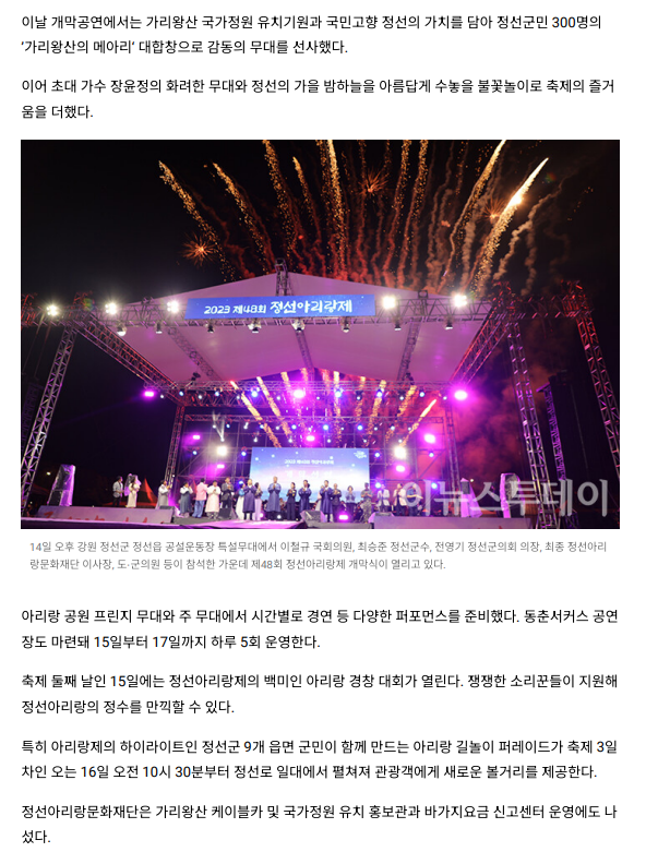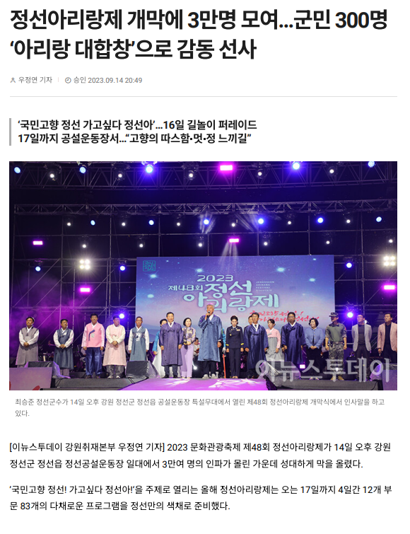 정선아리랑제 개막에 3만명 모여…군민 300명 ‘아리랑 대합창’으로 감동 선사 페이지 정보 작성자 관리자 작성일23-09-19 09:13 조회6,495회 관련링크 이전글 다음글 목록 본문 정선아리랑제 개막에 3만명 모여…군민 300명 ‘아리랑 대합창’으로 감동 선사 / 이뉴스투데이, 우정연 기자 이전글 다음글 목록
