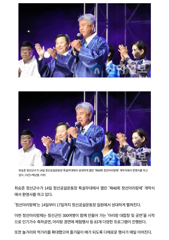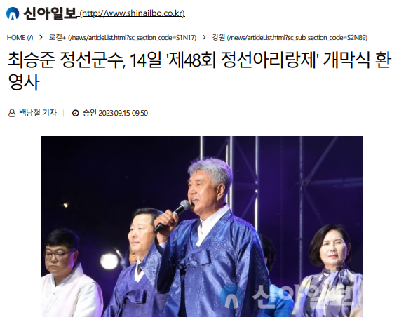 최승준 정선군수, 14일 '제48회 정선아리랑제' 개막식 환영사 페이지 정보 작성자 관리자 작성일23-09-19 09:55 조회8,222회 관련링크 이전글 다음글 목록 본문 최승준 정선군수, 14일 '제48회 정선아리랑제' 개막식 환영사 / 신아일보, 백남철 기자 이전글 다음글 목록