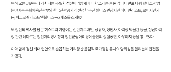 [강원푸드박람회] '국민고향' 정선군 부스에 연일 수도권 시민 북적 페이지 정보 작성자 관리자 작성일23-09-18 09:10 조회7,645회 관련링크 이전글 다음글 목록 본문 ○ [강원푸드박람회] '국민고향' 정선군 부스에 연일 수도권 시민 북적 / 강원일보, 김영석 기자 이전글 다음글 목록