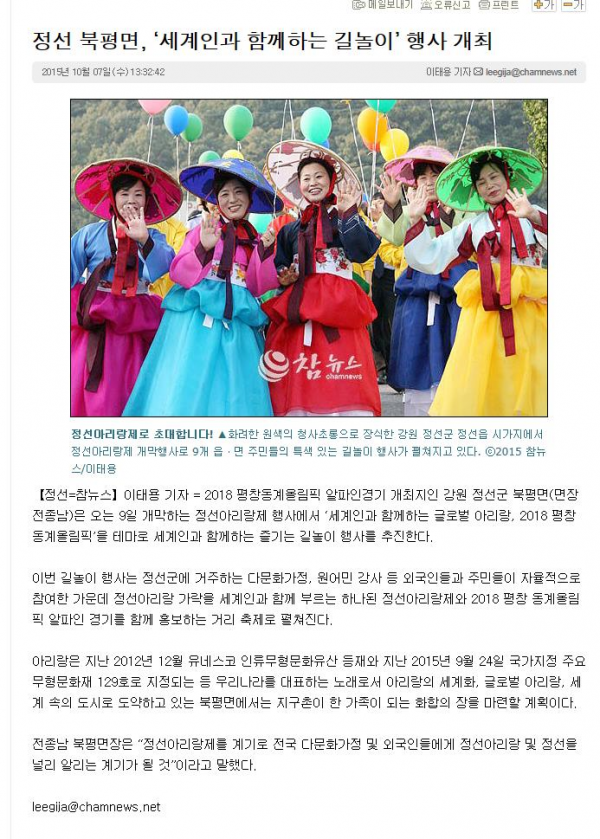 정선 북평면, '세계인과 함께하는 길놀이' 행사 개최 페이지 정보 작성자 관리자 작성일19-07-17 21:17 조회18,639회 관련링크 이전글 다음글 목록 본문 이전글 다음글 목록