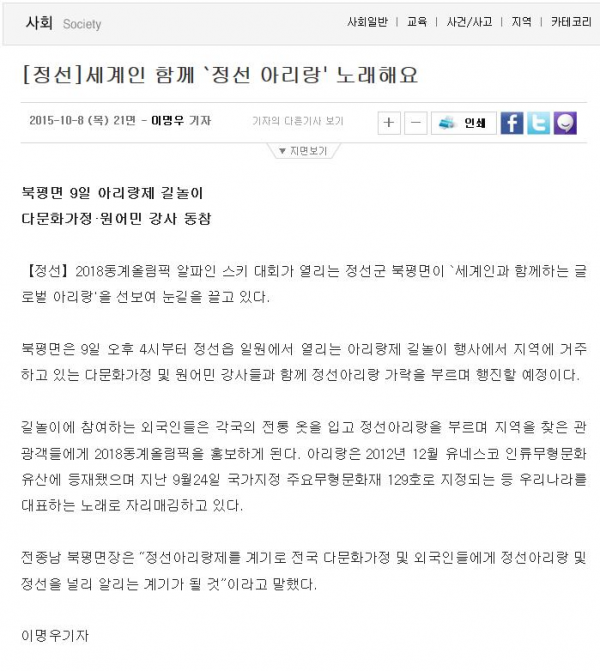 세계인 함께 ' 정선아리랑' 노래해요